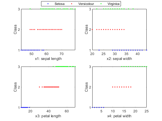dsProjPlot1(DS) plot output classes vs each feature. The number of subplots is equal to the number of features.