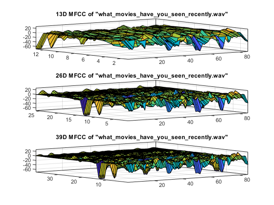 waveFile='what_movies_have_you_seen_recently.wav'; au=myAudioRead(waveFile); y=au.signal; fs=au.fs; opt=mfccOptSet(fs); opt.useDelta=0; mfcc0= wave2mfcc(y, fs, opt); fprintf('No. of extracted frames = %d\n', size(mfcc0, 2)); subplot(3,1,1); surf(mfcc0); box on; axis tight; title(strPurify(sprintf('13D MFCC of "%s"', waveFile))); opt.useDelta=1; mfcc1=wave2mfcc(y, fs, opt); subplot(3,1,2); surf(mfcc1); box on; axis tight; title(strPurify(sprintf('26D MFCC of "%s"', waveFile))); opt.useDelta=2; mfcc2=wave2mfcc(y, fs, opt); subplot(3,1,3); surf(mfcc2); box on; axis tight; title(strPurify(sprintf('39D MFCC of "%s"', waveFile)));